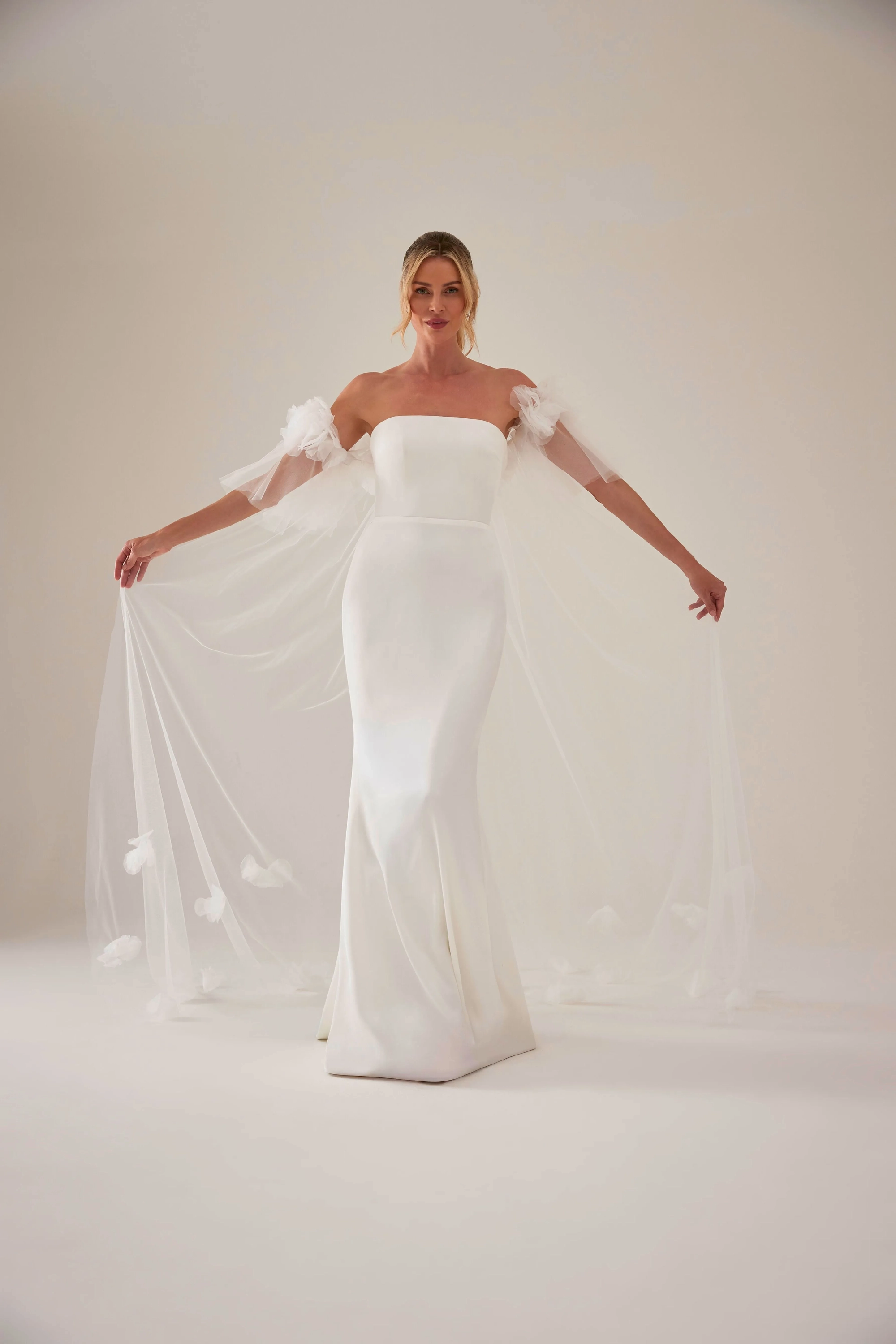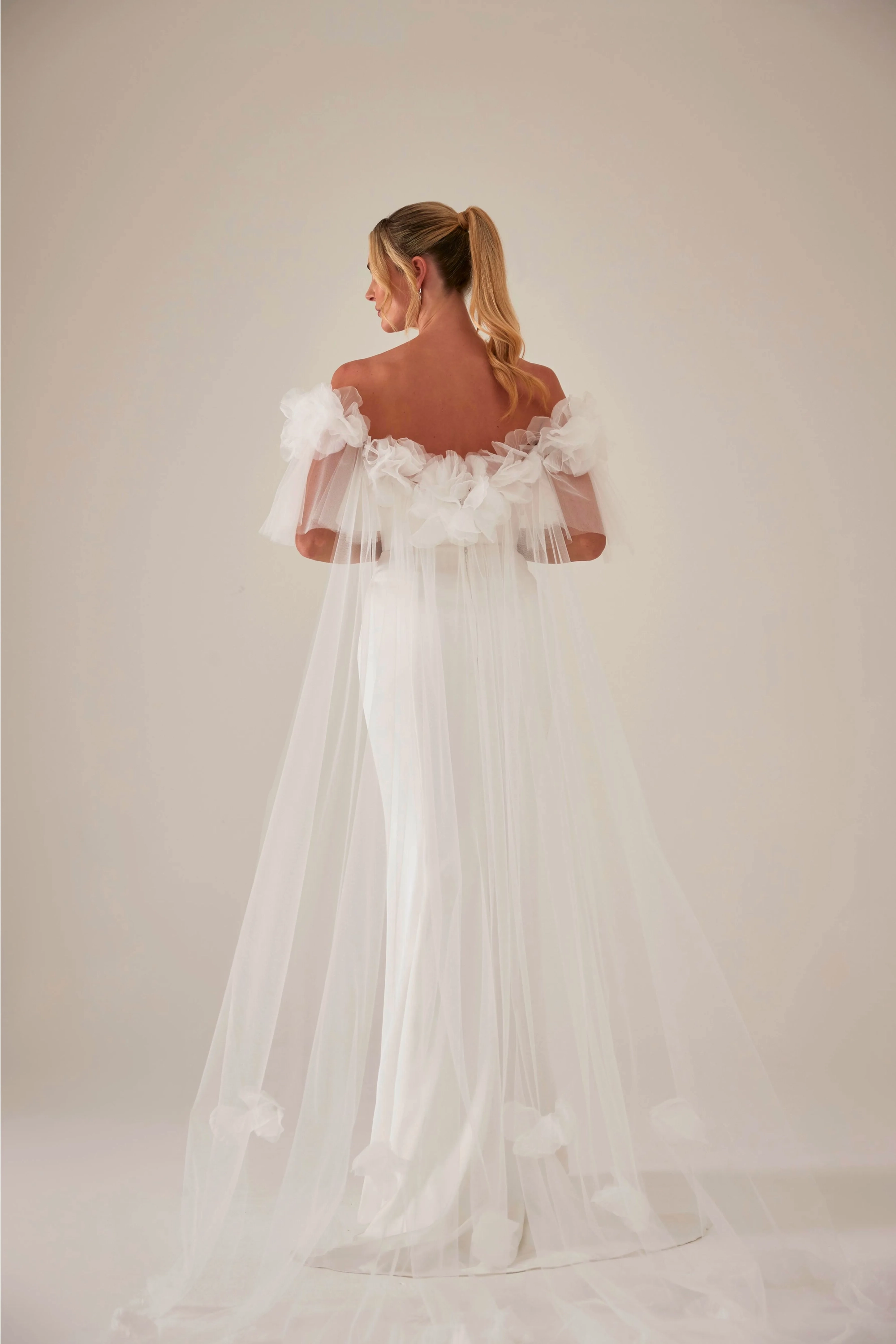 The Brianna Cape is a dramatic theatre-inspired layer in ethereal tulle. Designed with soft ruffle sleeves and finished with delicate hand-appliquéd organza detailing at the neckline, it adds a romantic, couture edge to any bridal look. Perfect for pairing with gowns or separates to create unforgettable aisle drama.