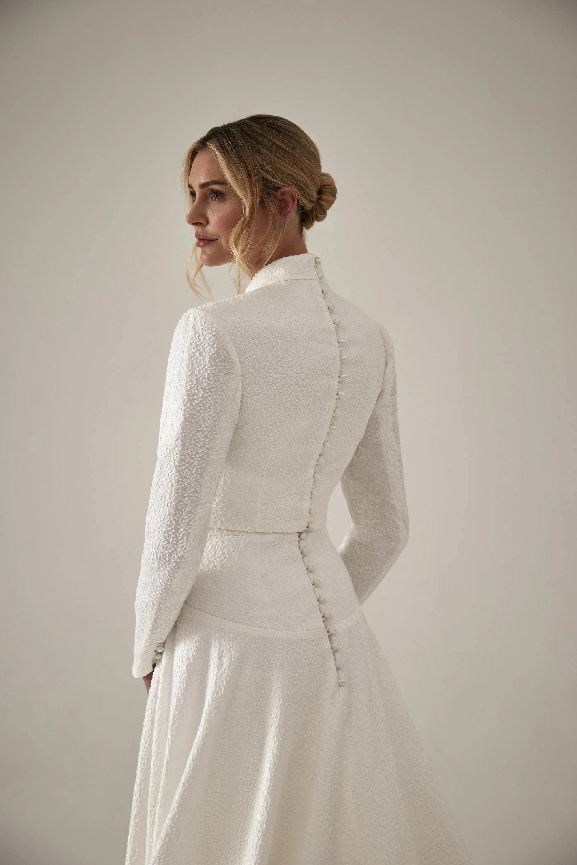 The Chelsea topper brings sophisticated structure to any bridal ensemble. Crafted in a soft jacquard fabric, it features a high neckline, long sleeves, and a clean silhouette that layers seamlessly over strapless or sleeveless gowns. Ideal for adding coverage and style to your ceremony look while allowing for a wardrobe change later in the day.