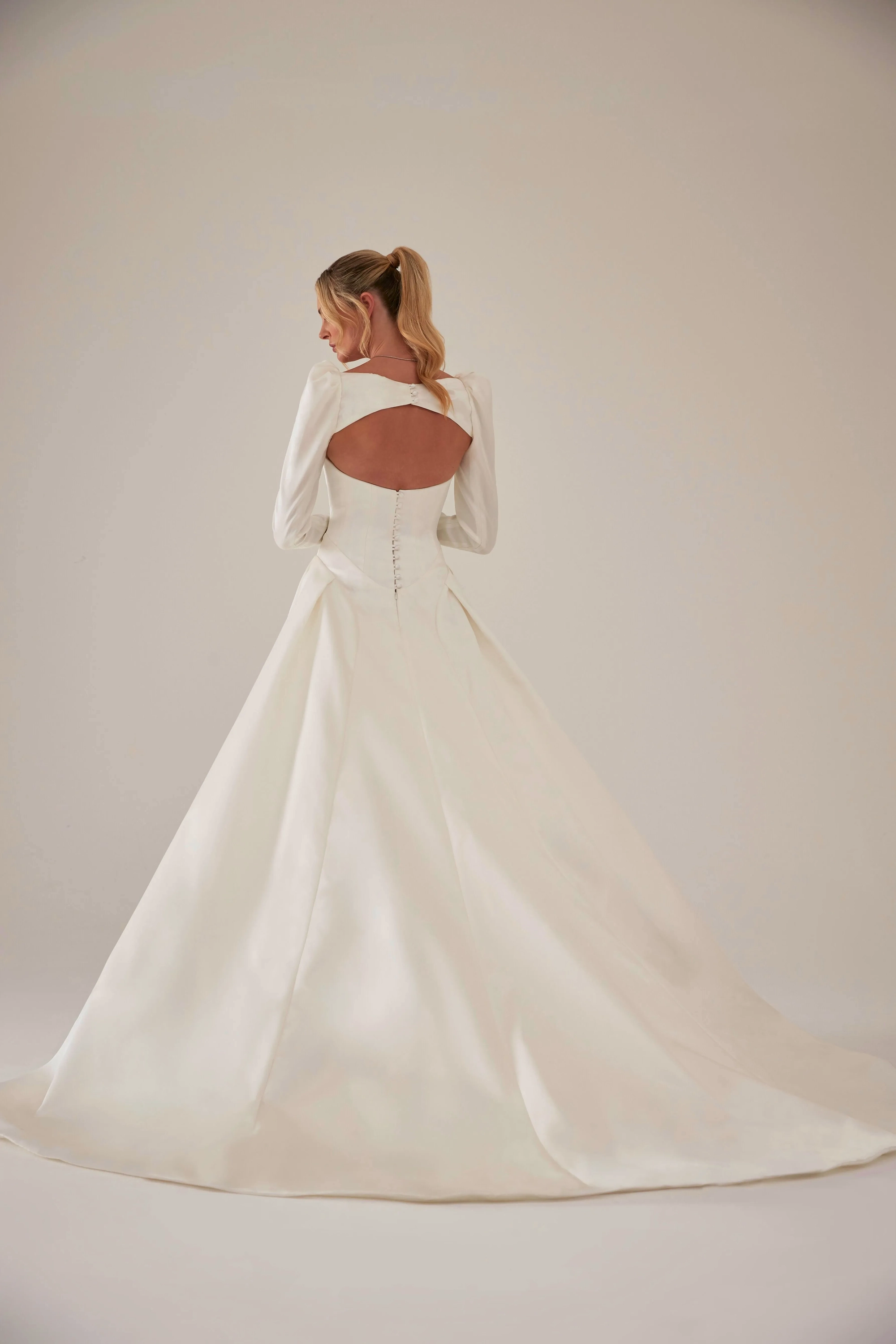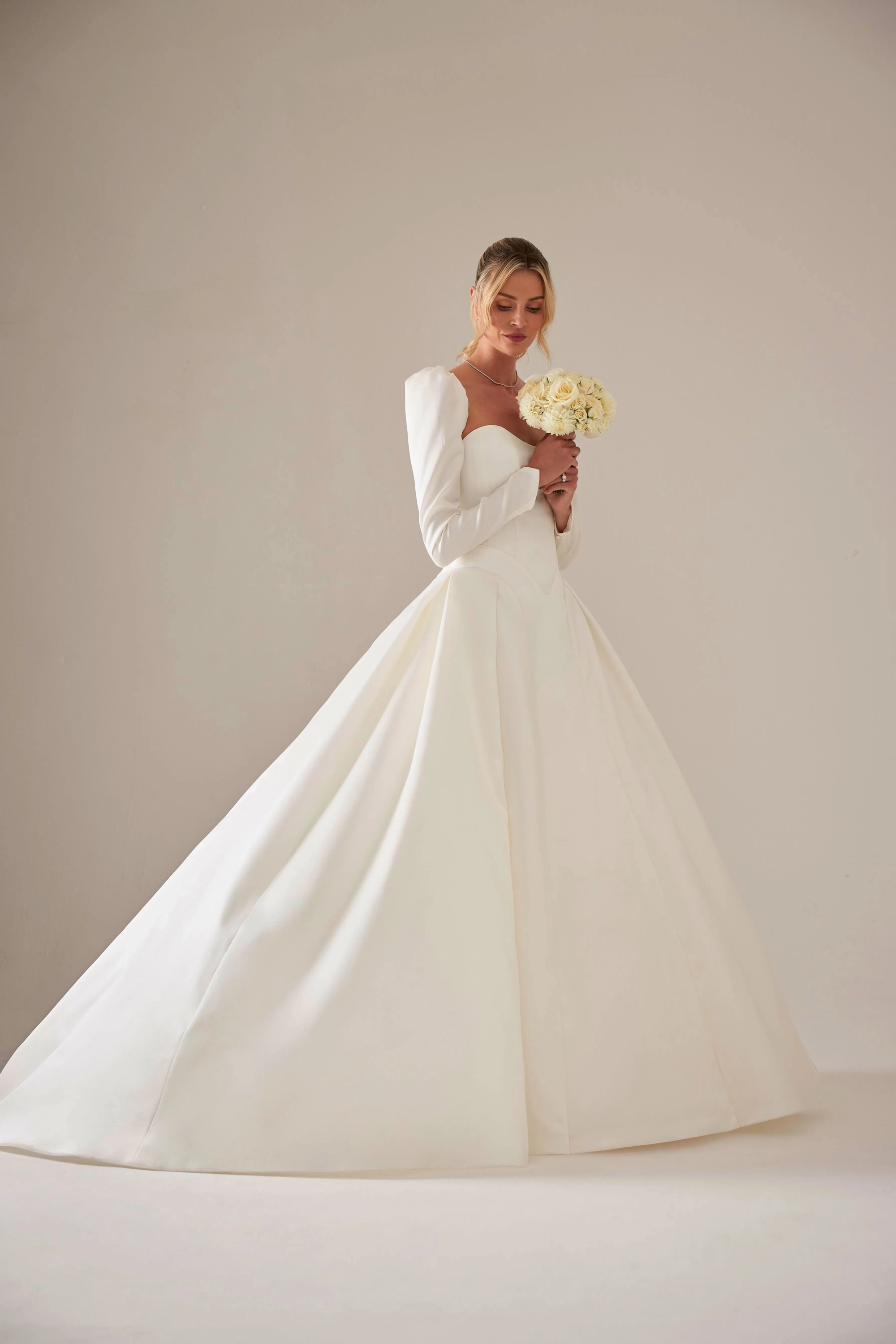 Clemmie is a modern classic, defined by clean lines and couture structure. The corset bodice features a soft smile neckline and curved basque waist, creating an elegant silhouette that flows seamlessly into a sculpted paneled skirt. Crafted in lustrous silk-blend satin gazar, Clemmie embodies timeless sophistication with contemporary refinement.