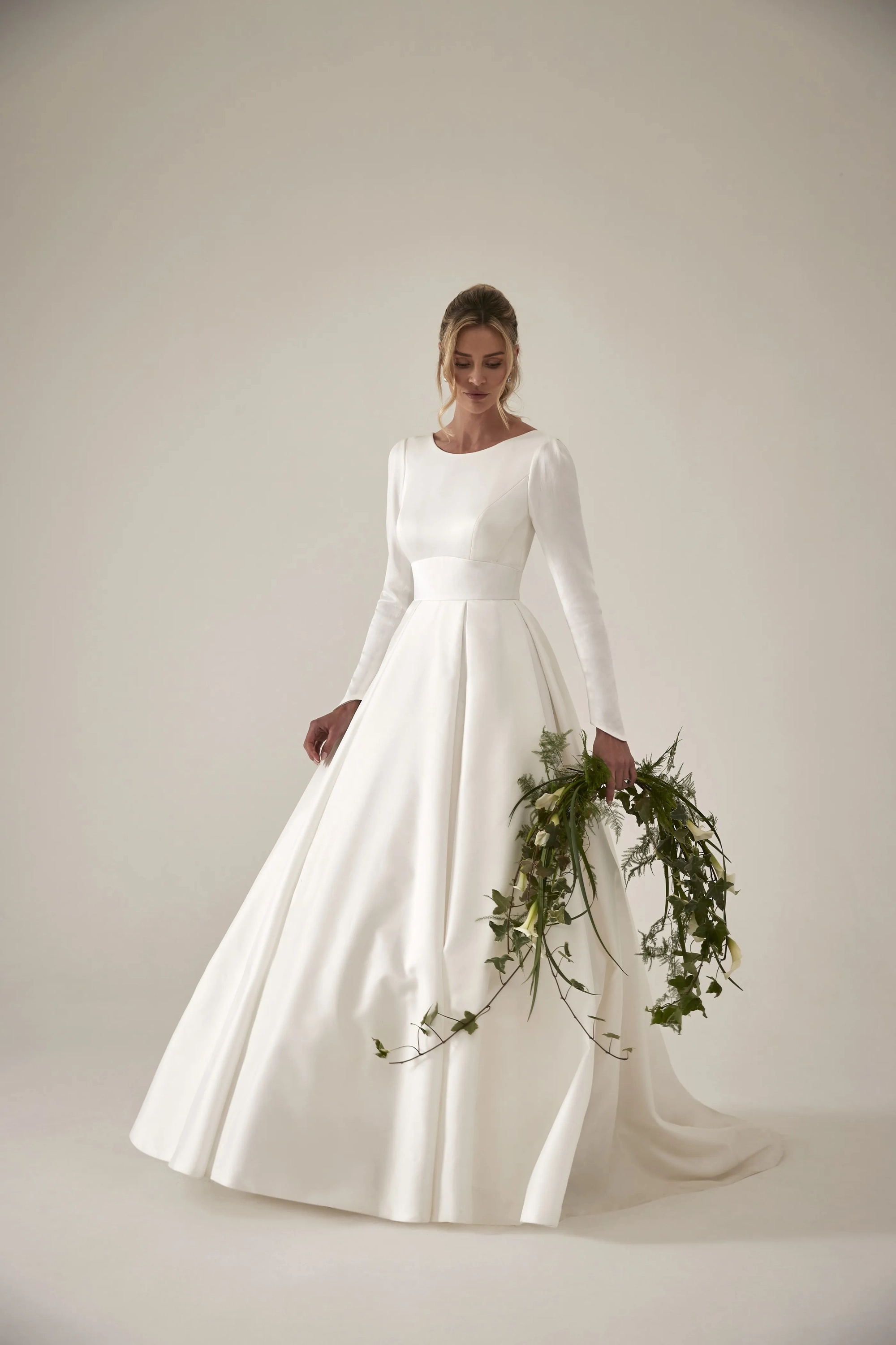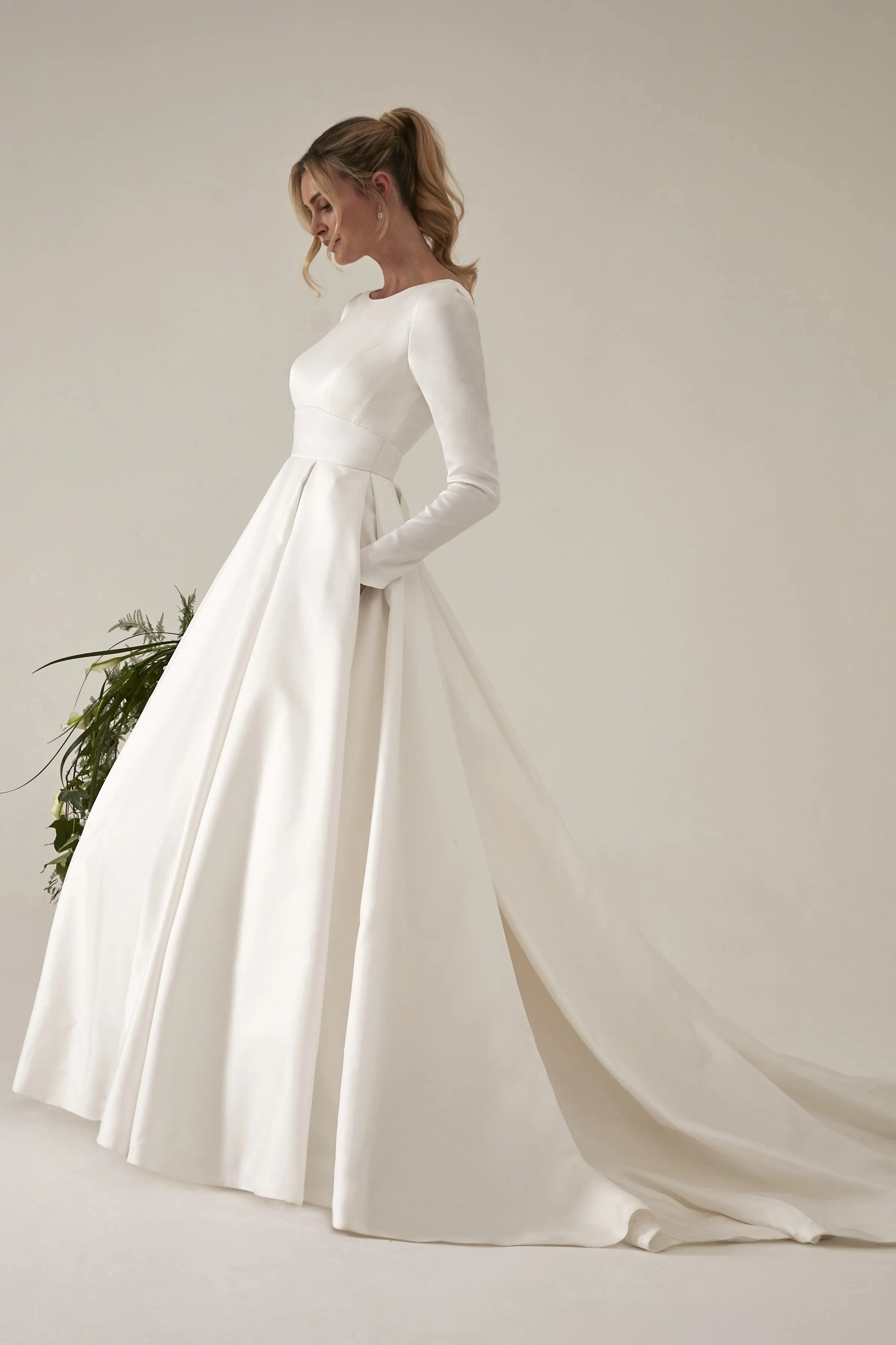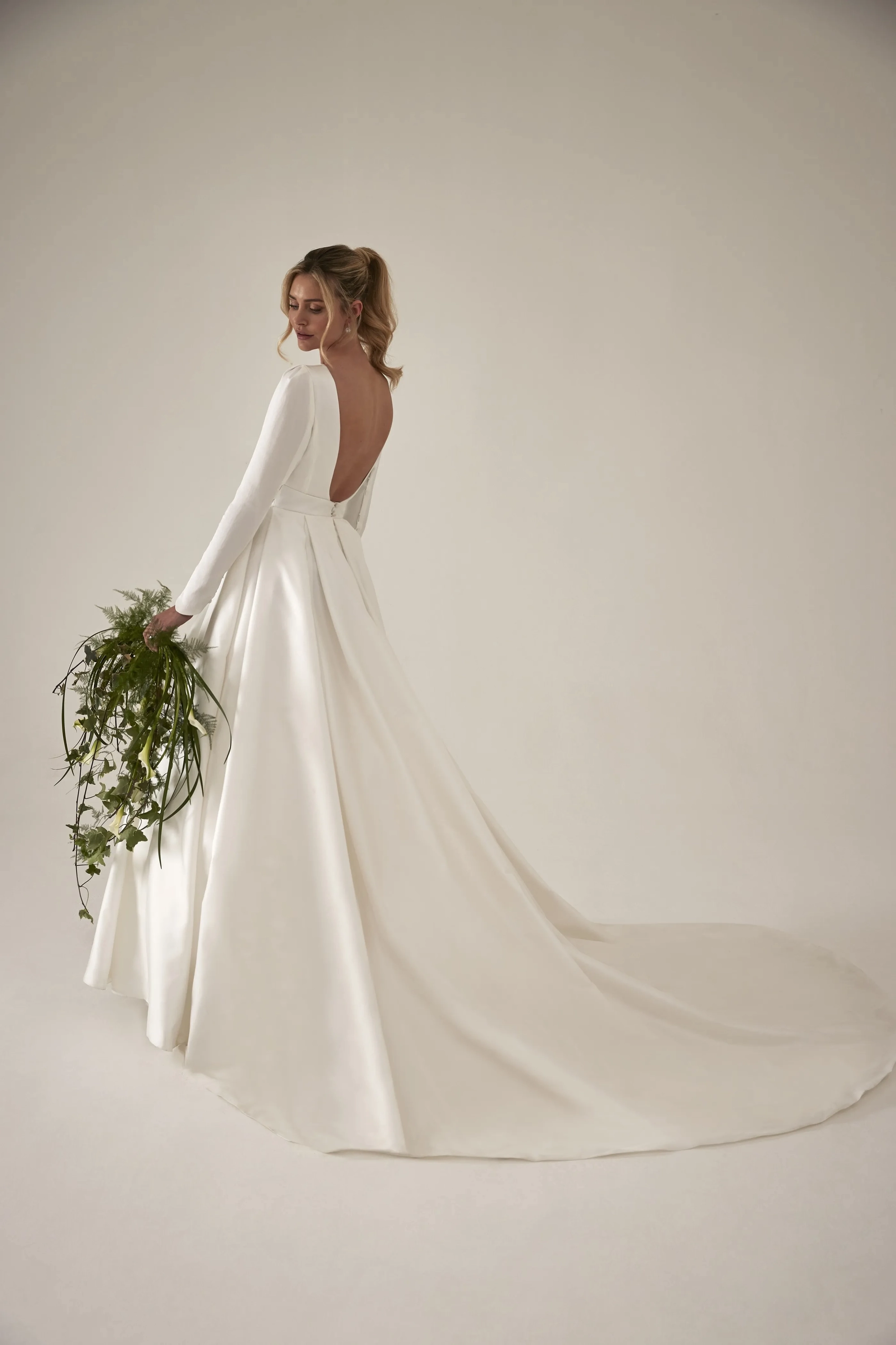 Josephine is a timeless statement in modern bridal elegance. The fitted crepe bodice features a sophisticated bateau neckline and long sleeves, offering a clean and graceful silhouette. Paired with a full box-pleated skirt in a luxurious silk-blend fine Mikado, this gown creates a striking balance of structure and softness - perfect for the bride seeking poise, polish, and unforgettable presence.