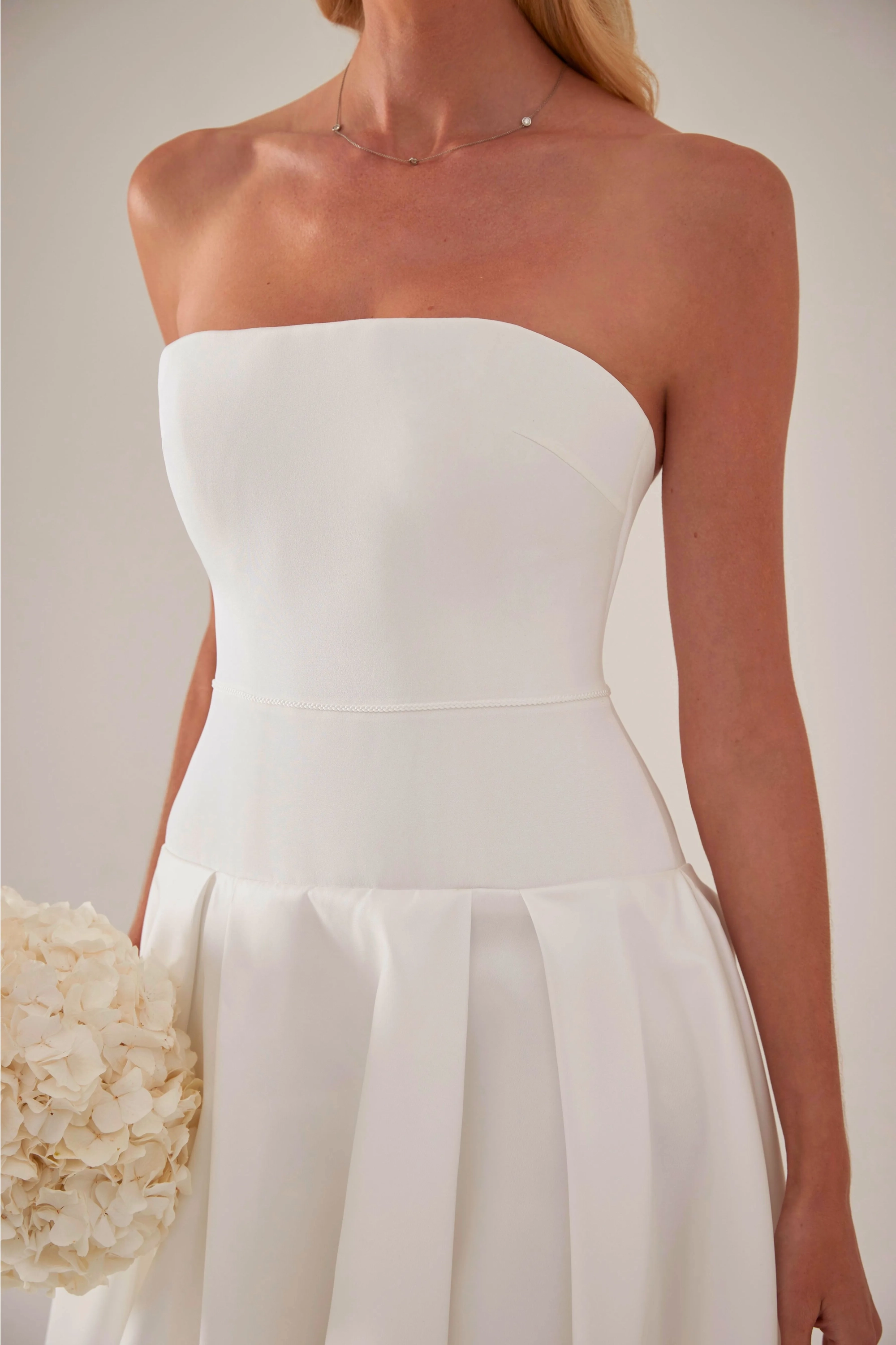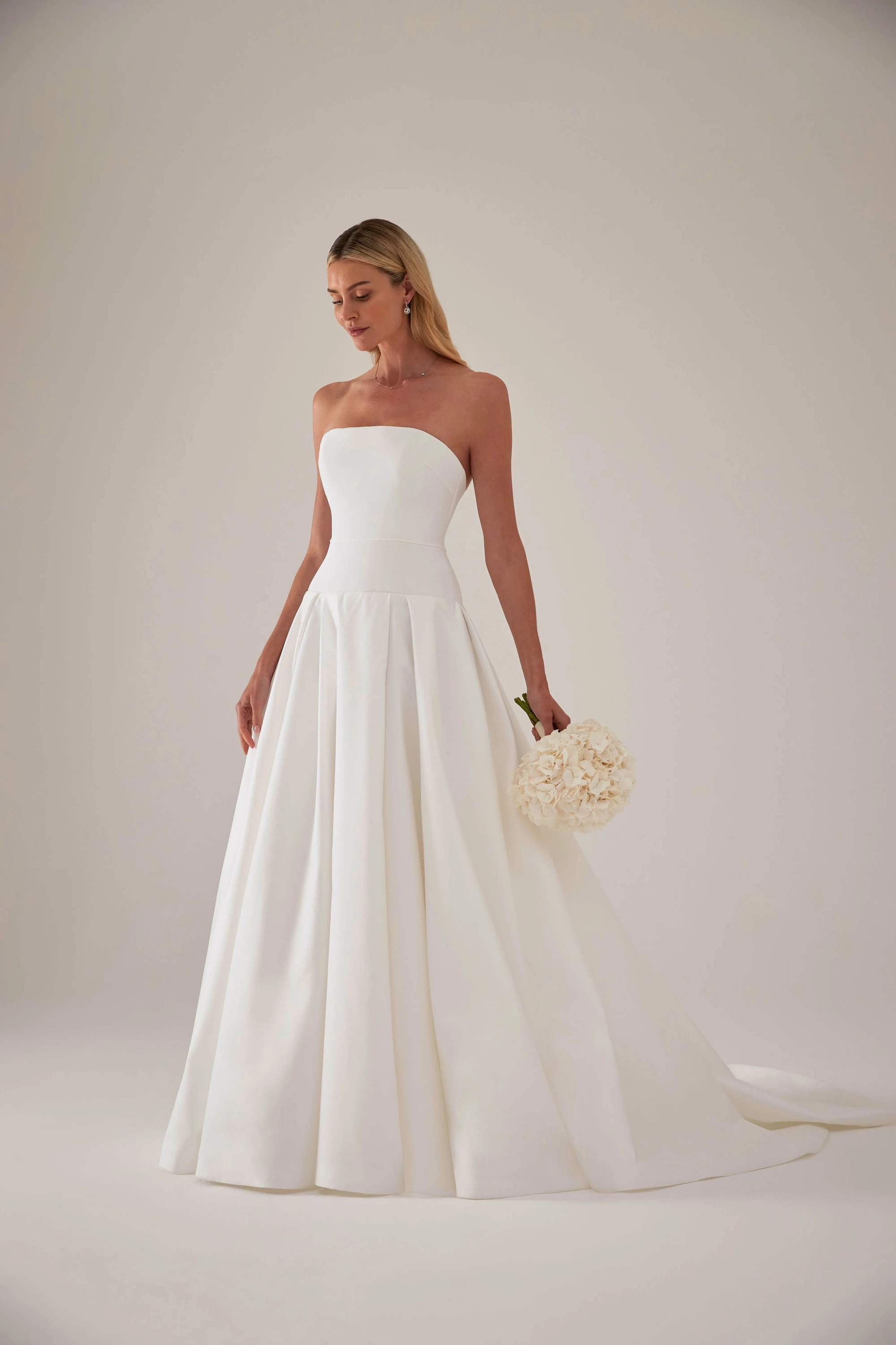 Verity is a modern classic with effortless elegance. The moulded strapless silk crepe bodice features a dropped yoke waist, flowing gracefully into a full lightweight mikado A-line skirt. Designed to flatter the silhouette while offering movement and structure, Verity is perfect for the contemporary bride.